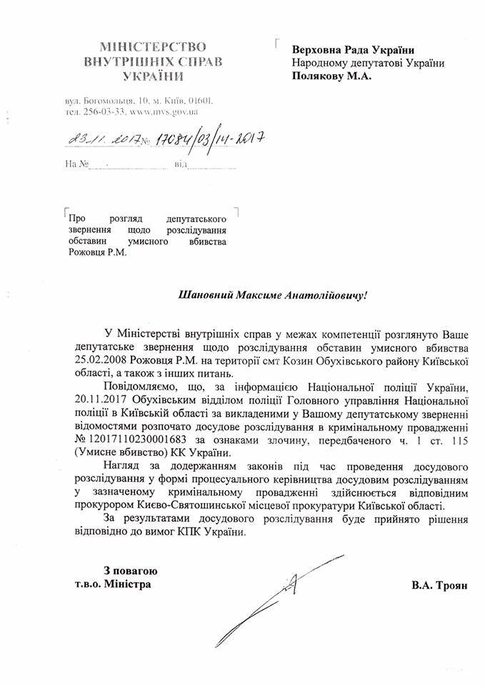 У відповіді МВС повідомляється, що поліція почала досудове розслідування у кримінальному провадженні за ч.1 ст.115 КК України – умисне вбивство.