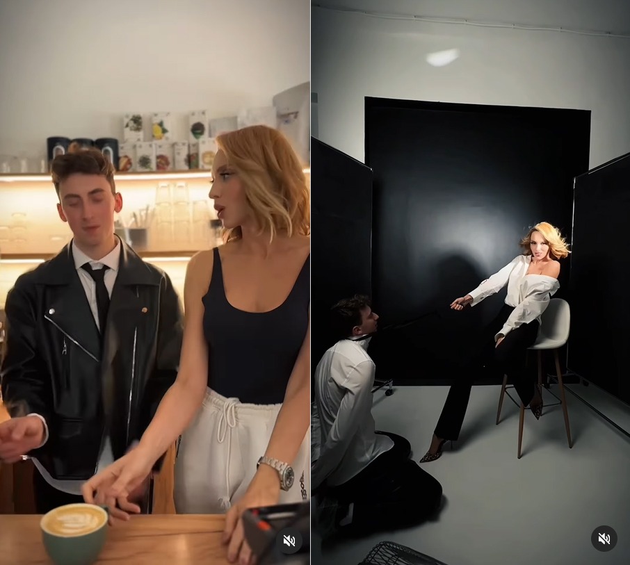 І тут же втілила власну мрію у життя. На наступних кадрах ми бачимо артистку у фривольній позі, яка тягне до себе баристу за краватку. Молодик при цьому стоїть навколішках, а руки в нього зав’язані ззаду.